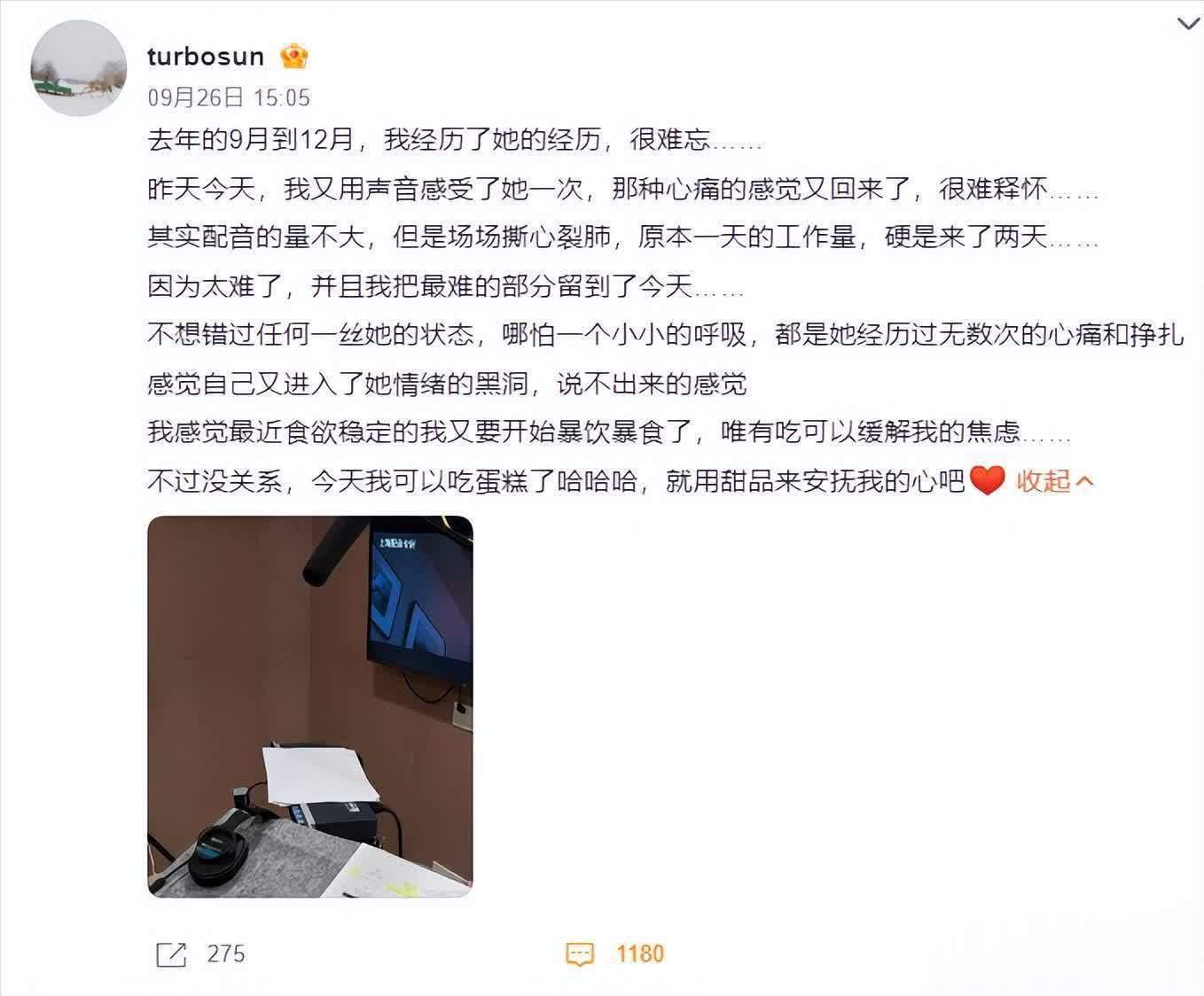 近期她给一部作品配音,因为这个角色的感情很令人难忘,所以没一次配音都感觉很心痛。
